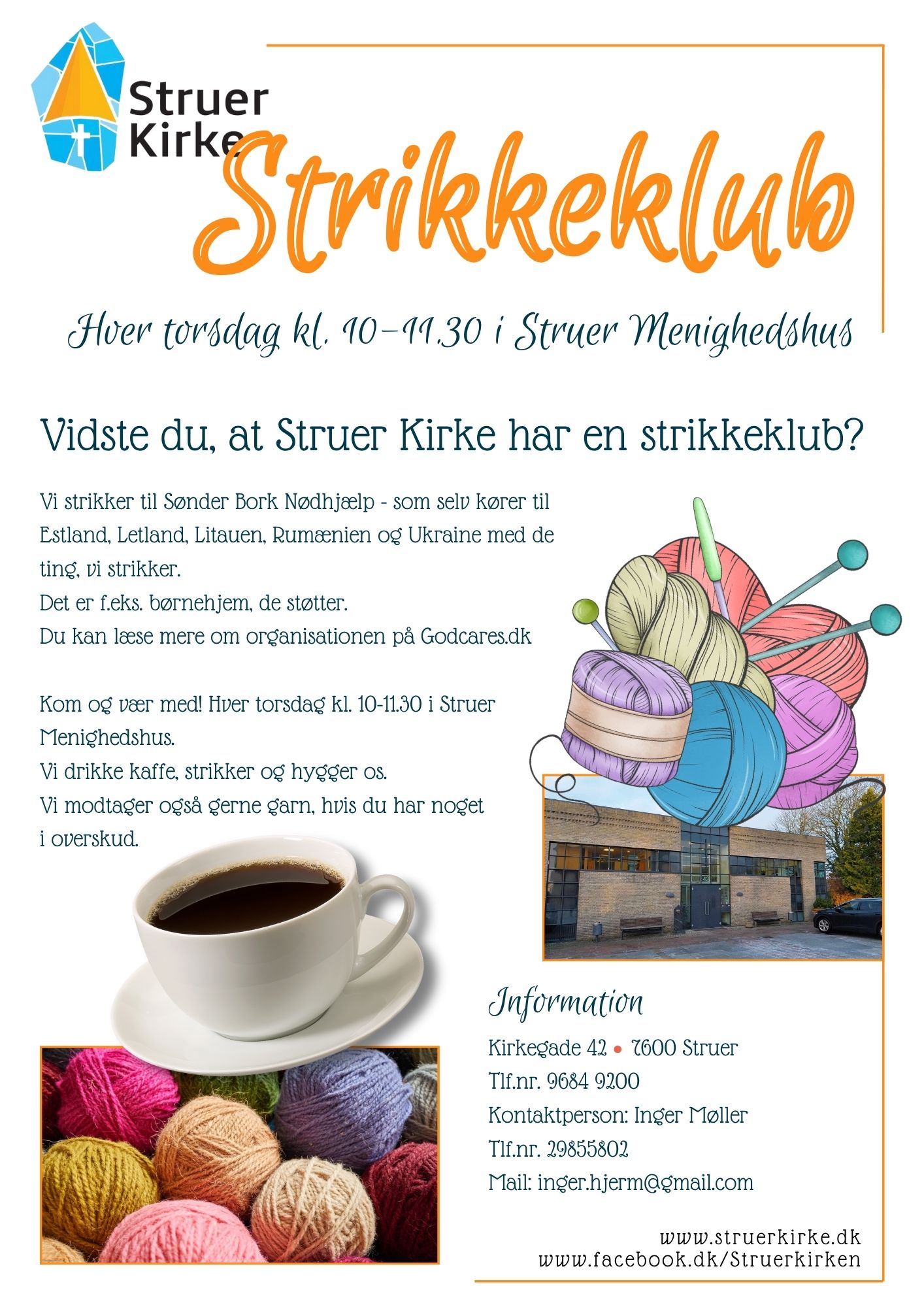 Kom og være med! Hver torsdag formiddag kl. 10 - 11.30 i Menighedshuset. Vi drikker kaffe, strikker og hygger os. -Og der er plads til flere der har lyst til at være med i et hyggeligt samvær og i en god sags tjeneste. Bare mød op eller ring til Inger Møller tlf 29855802 - der er brug for at hjælpe folk ude i verden.