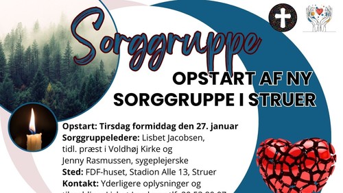 Menighedsplejen og Kirkernes Sociale Arbejde i Struer Kommune tilbyder Sorggruppe. Der startes en ny gruppe op tirsdag den 27. januar. kl. 10.00 . Det foregår i FDF-Huset på Stadion Alle 13 i Struer, Alle interesserede skal tilmelde sig inden ved at ringe til Lisbet Jacobsen, tidligere præst i Voldhøj kirke på tlf. 20 53 80 07. Ring endelig til Lisbet hvis du gerne vil vide mere. Måske kender du én der kunne have brug for det fællesskab. Se mere info HER