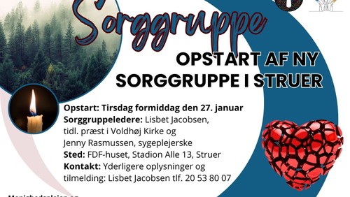Menighedsplejen og Kirkernes Sociale Arbejde i Struer Kommune tilbyder Sorggruppe. Der startes en ny gruppe op tirsdag den 27. januar. kl. 10.00 . Det foregår i FDF-Huset på Stadion Alle 13 i Struer, Alle interesserede skal tilmelde sig inden ved at ringe til Lisbet Jacobsen, tidligere præst i Voldhøj kirke på tlf. 20 53 80 07. Ring endelig til Lisbet hvis du gerne vil vide mere. Måske kender du én der kunne have brug for det fællesskab. Se mere info HER
